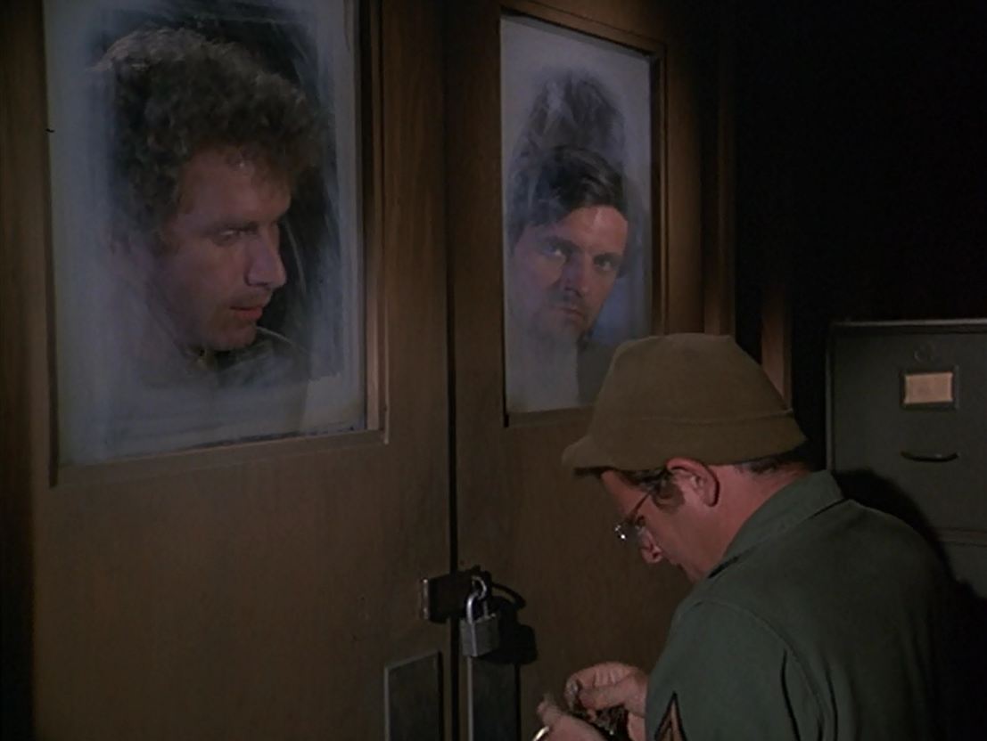 Frank locks Hawkeye and Trapper in Henrys office. Radar cannot open the door, but after Hawkeye and Trapper have escaped by pulling down one wall of the office, Henry, followed by Frank, runs into the office without unlocking the door.