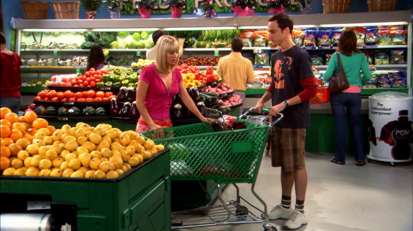 Penny comes over and asks if Sheldon needs any thing from the market. Sheldon’s request for eggs of various types and sizes confuses her and decides to tags along. He manages to annoy her after lecturing her on the distance between cars, fun facts on tomatoes, multivitamins and his suggestion of buying tampons in bulk.