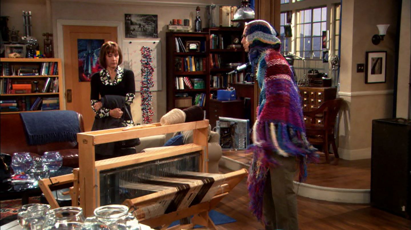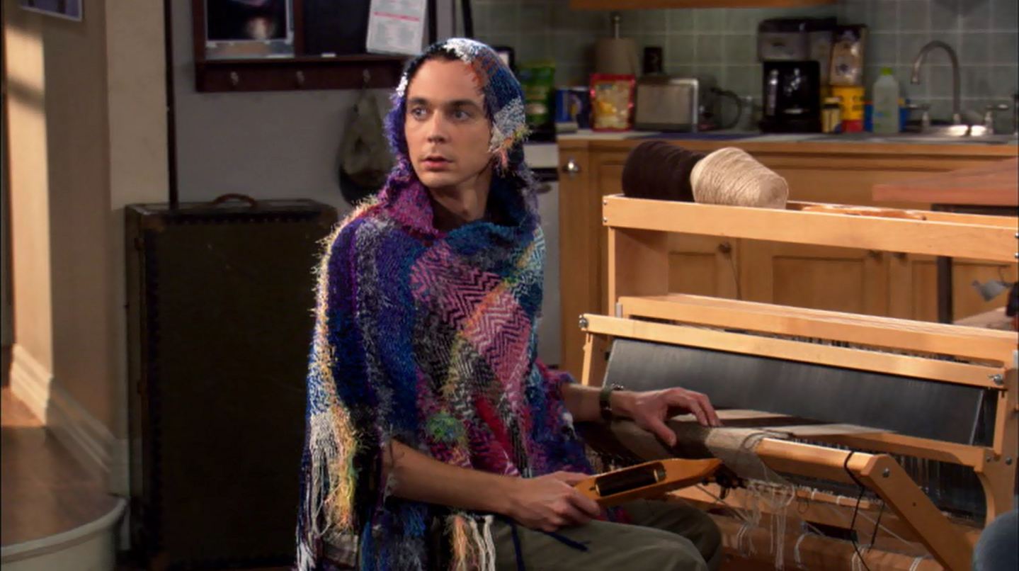 Leonard: I didn’t know what else to do, he’s lost all focus, every day he’s got a new obsession. (They enter the apartment. Sheldon is weaving on a loom. He is wrapped in a poncho.) This is a particularly disturbing one.