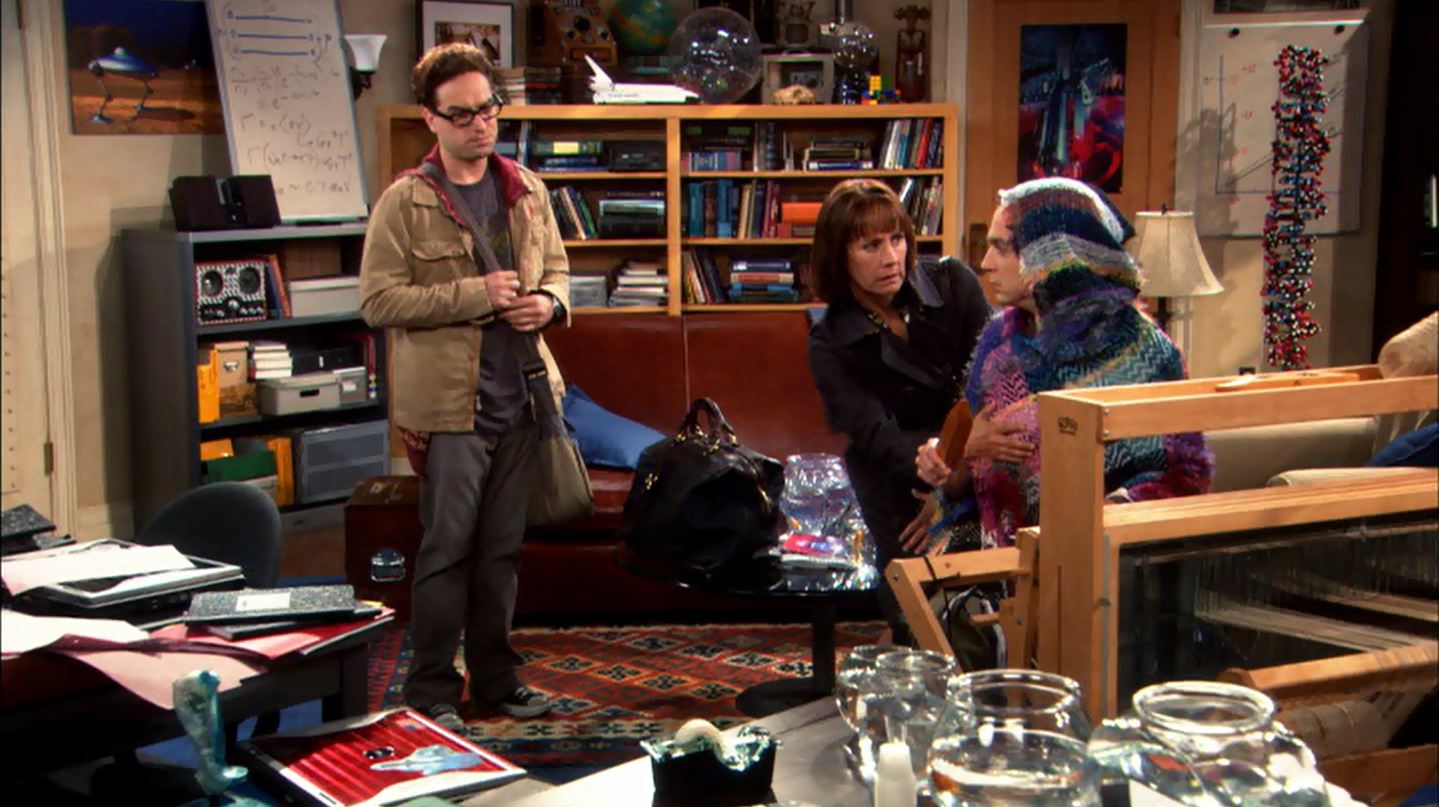 Leonard comes back to find Sheldon experimenting with Luminous Fish. Later, Leonard brings Sheldon’s Mother, Mary Cooper to Pasadena to help with Sheldon, who is making serapes and ponchos on a loom. This angers Sheldon, Leonard calling his mom and telling on him to his mother and runs to his room.