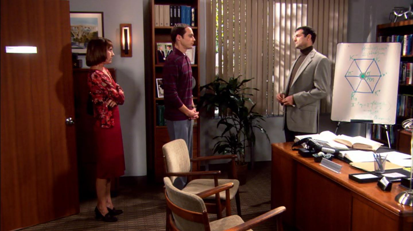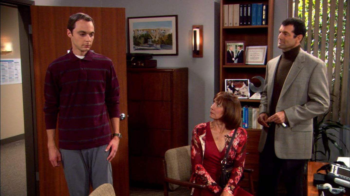 Mary makes dinner for the gang, and explains that Sheldon was always like this. Sheldon comes out of his room for some food, Mary, “you have to let him (Sheldon) come to you”, Leonard clearly ignores her warning and soon enough, Sheldon has locked himself in his room again.