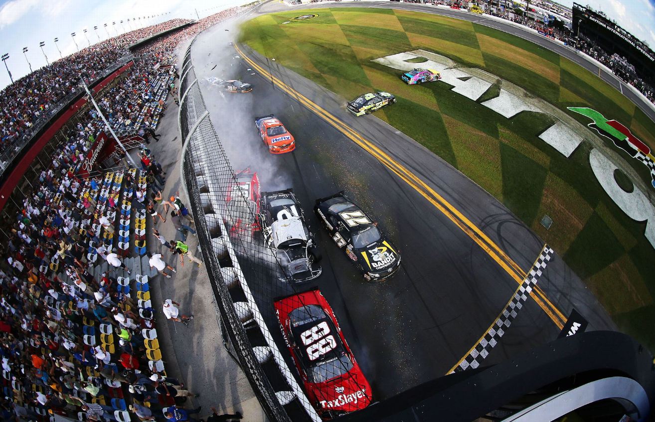 Kyle Larson’s car was launched into the fence injuring at least 28 people, two critically, during the multi-car pileup on the last lap allowing Tony Stewart to take the checkered flag.