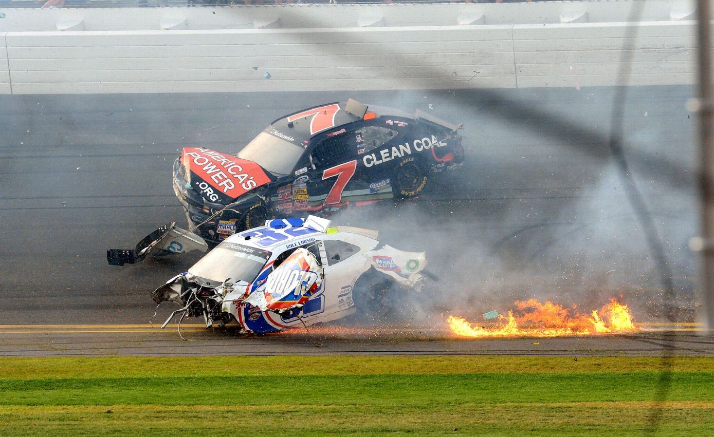 The suspension and tires from Larson’s car flew into the fence, with one tire sailing over it. Officials confirmed that 14 people were transported to Halifax Medical Center off property and an additional 14 were treated in the at-track care center.