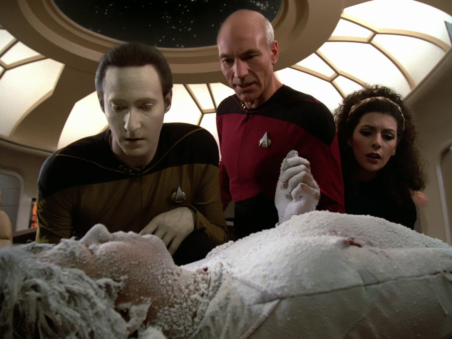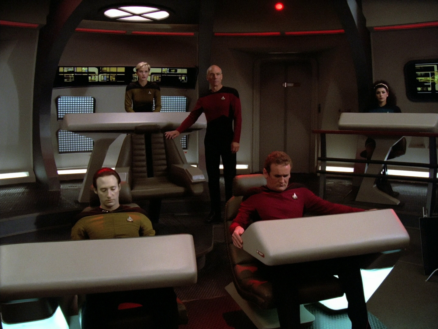 After separating the saucer to protect the families on board, Picard stays behind to face Q. Suddenly, the ship begins shaking as it did when Q first appeared, and after a bright flash of light, Picard, Data, Troi and Tasha find themselves in a 21st century courtroom. As the bailiff announces the judge, the crew is shocked to find Q sitting on the bench!