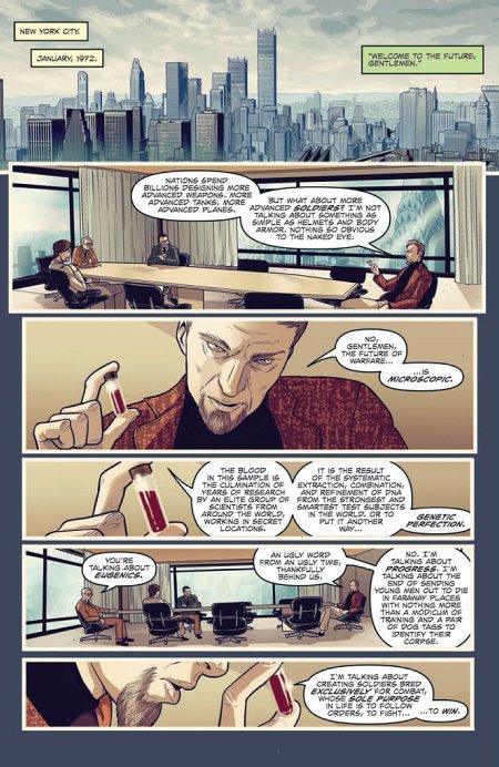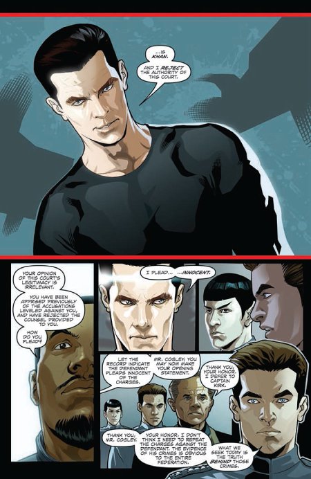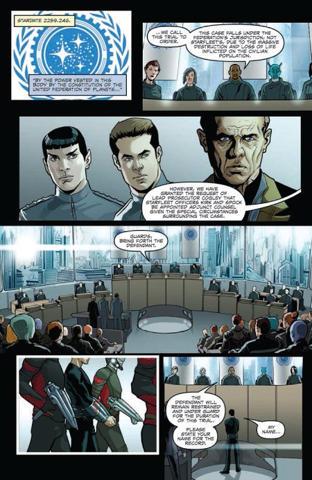 Star Trek: Khan #1 opens with the Federation stating its case against Khan Noonien Singh, Khan rejecting the court’s authority and then pleading innocent to the charges leveled against him in the aftermath of the events of Star Trek Into Darkness. The story then flashes back to Khan’s history, from his childhood to his rise to power during the Eugenics Wars, and also examines his reawakening at the hands of Admiral Marcus and Section 31.