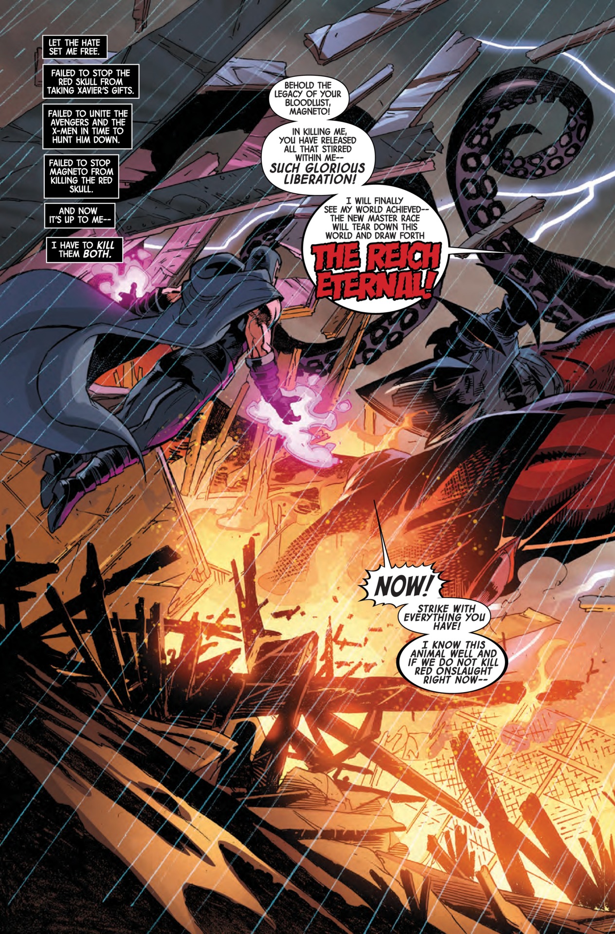 The Red Skull has exploited the gifts of the world’s greatest telepath to broadcast pure hatred across the globe. Now, born of the murder of Charles Xavier, World War Hate has begun.