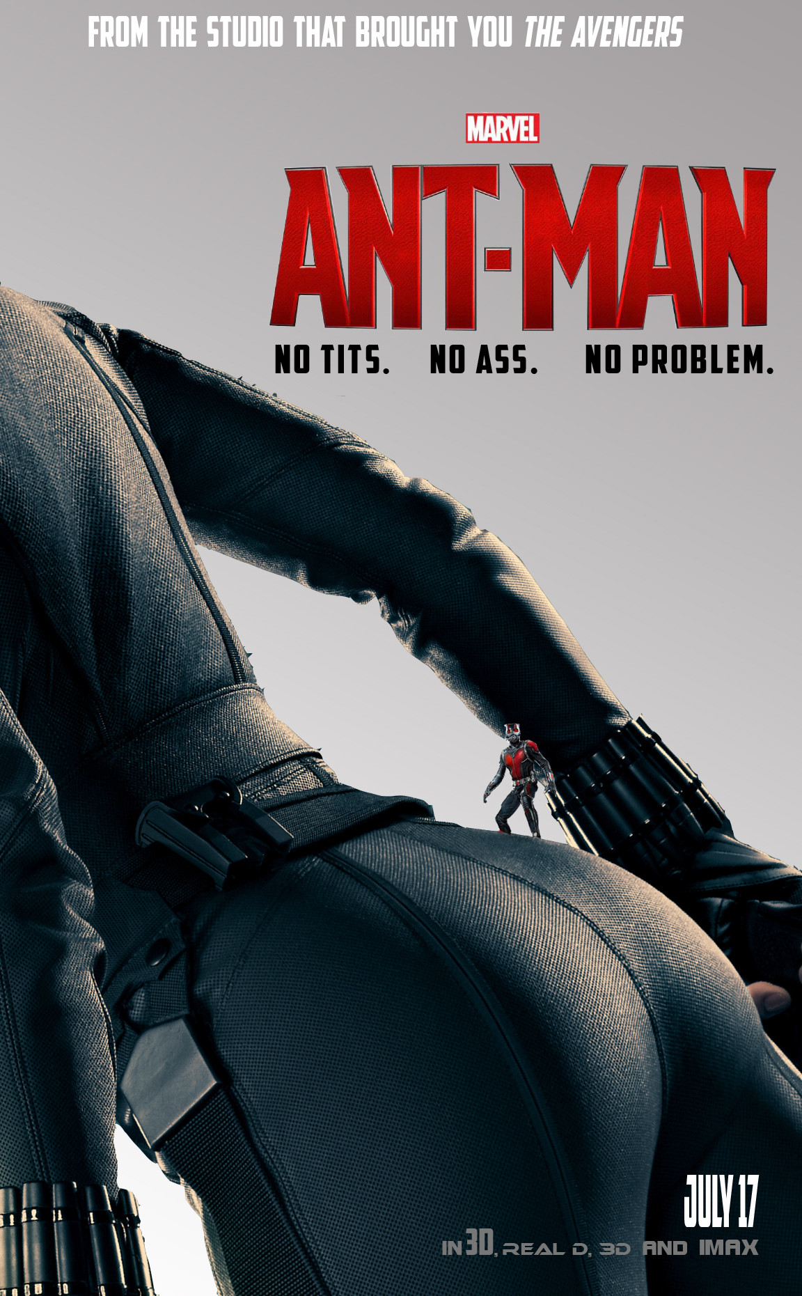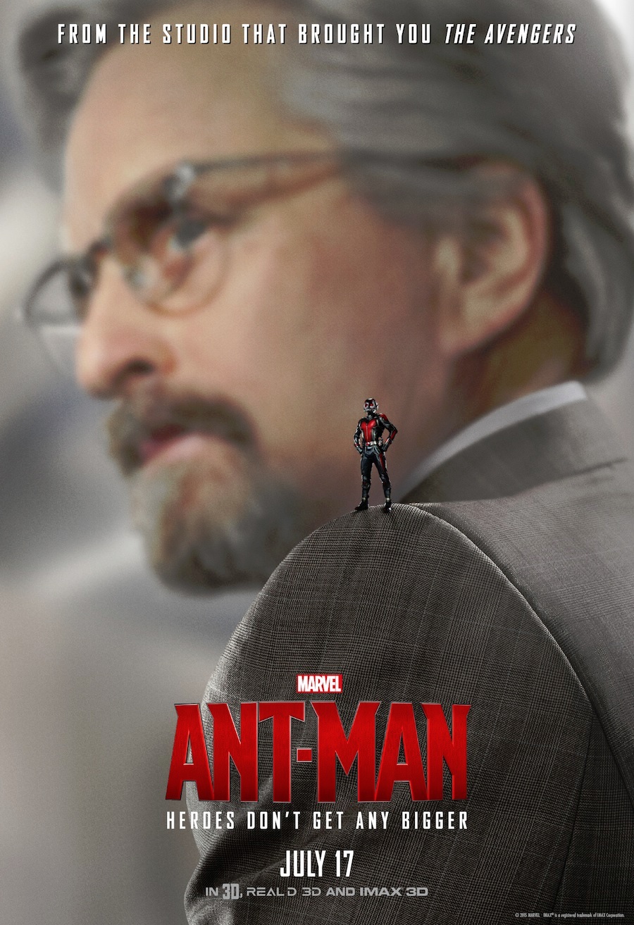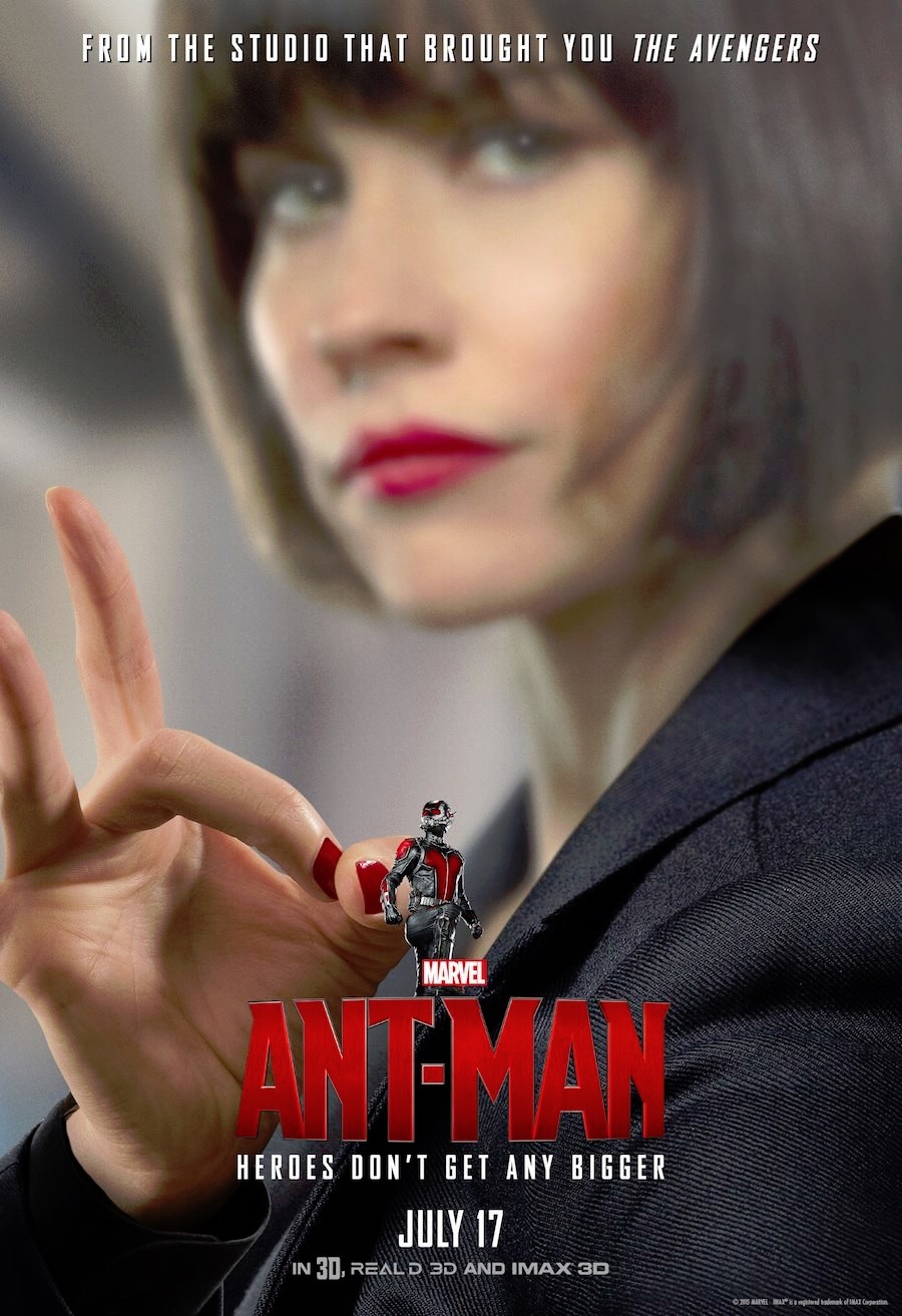 The final two posters at the bottom of this posting are fan made and based on the poster design that were released in early June when Marvel put Ant-Man with Iron-Man, Thor and Captain America. This particular fan used Black Widow, placing out tiny hero in well two very unique places on Black Widow herself.