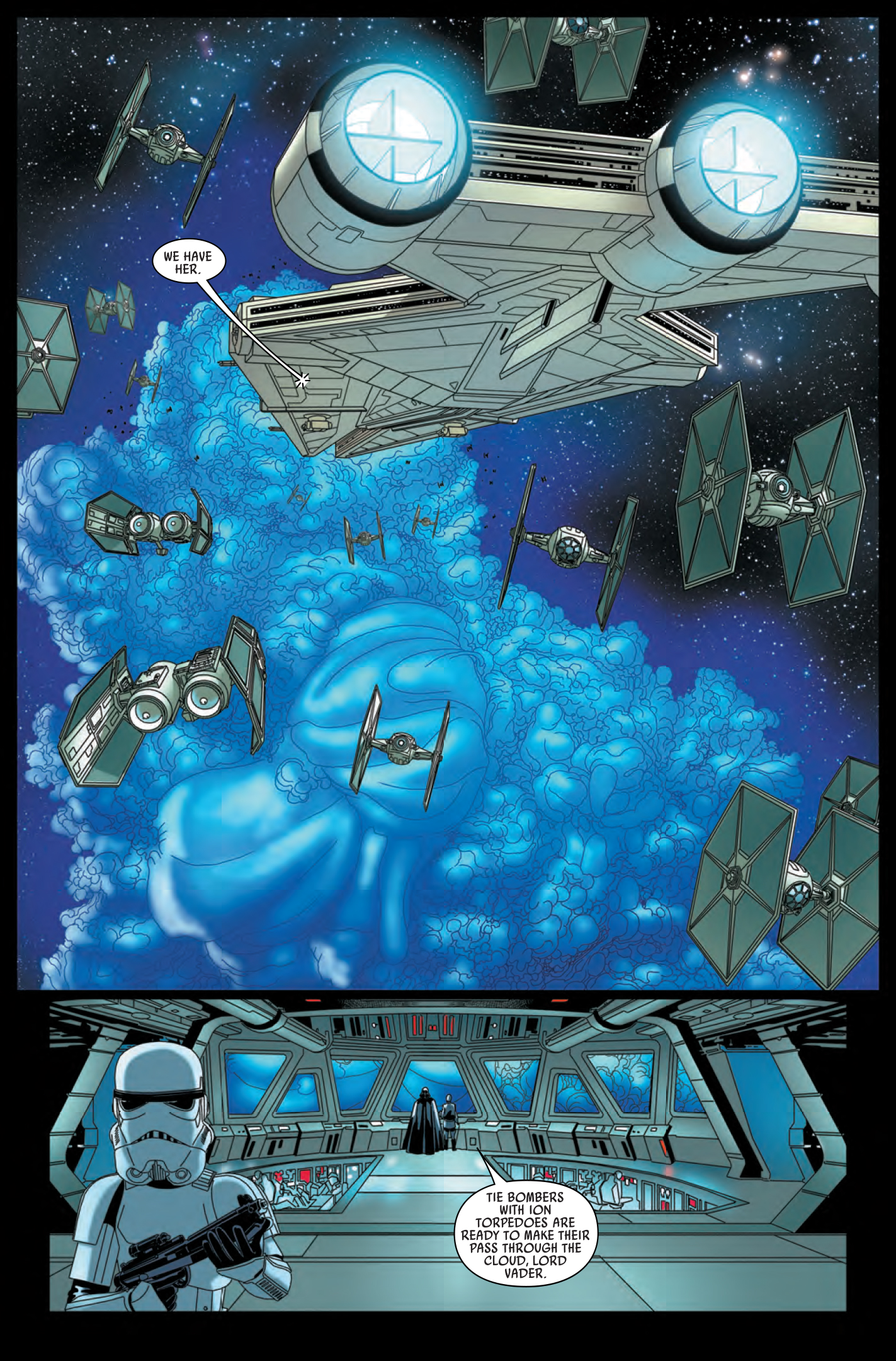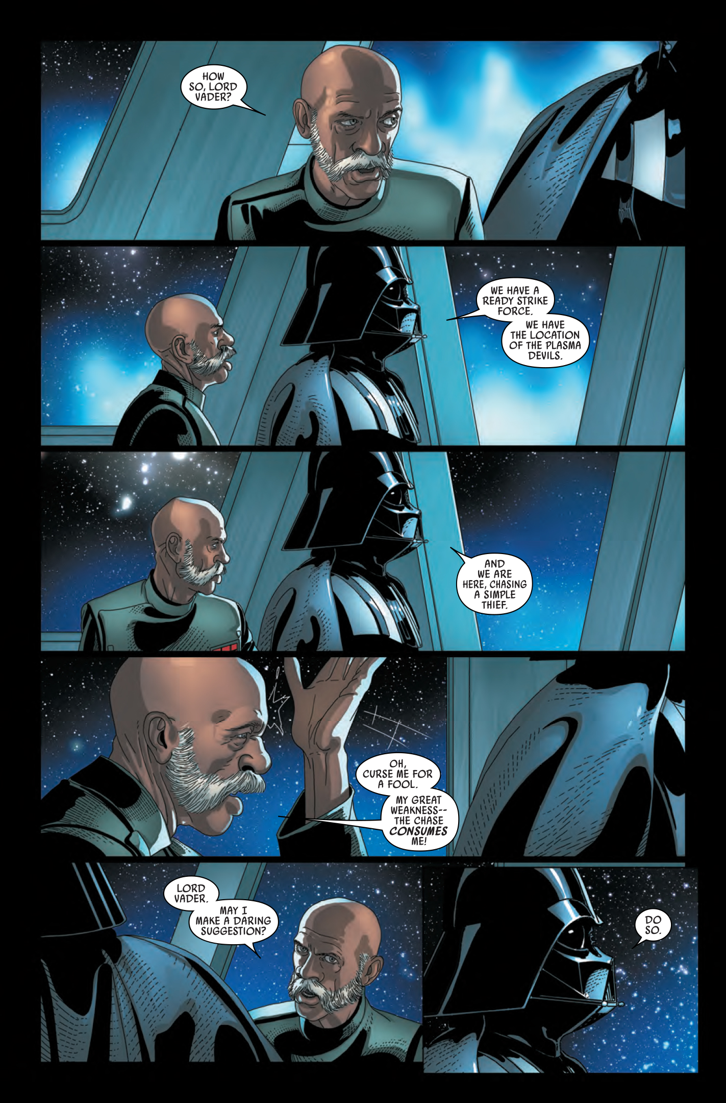 Darth Vader and Thanoth arrive just in time to discover that Aphra is the one who stole the mission’s credits. They also manage to get the location of the Plasma Devils from The Ante before the information broker is killed. Aphra nearly escapes, but Darth Vader and Thanoth now have her cornered.
