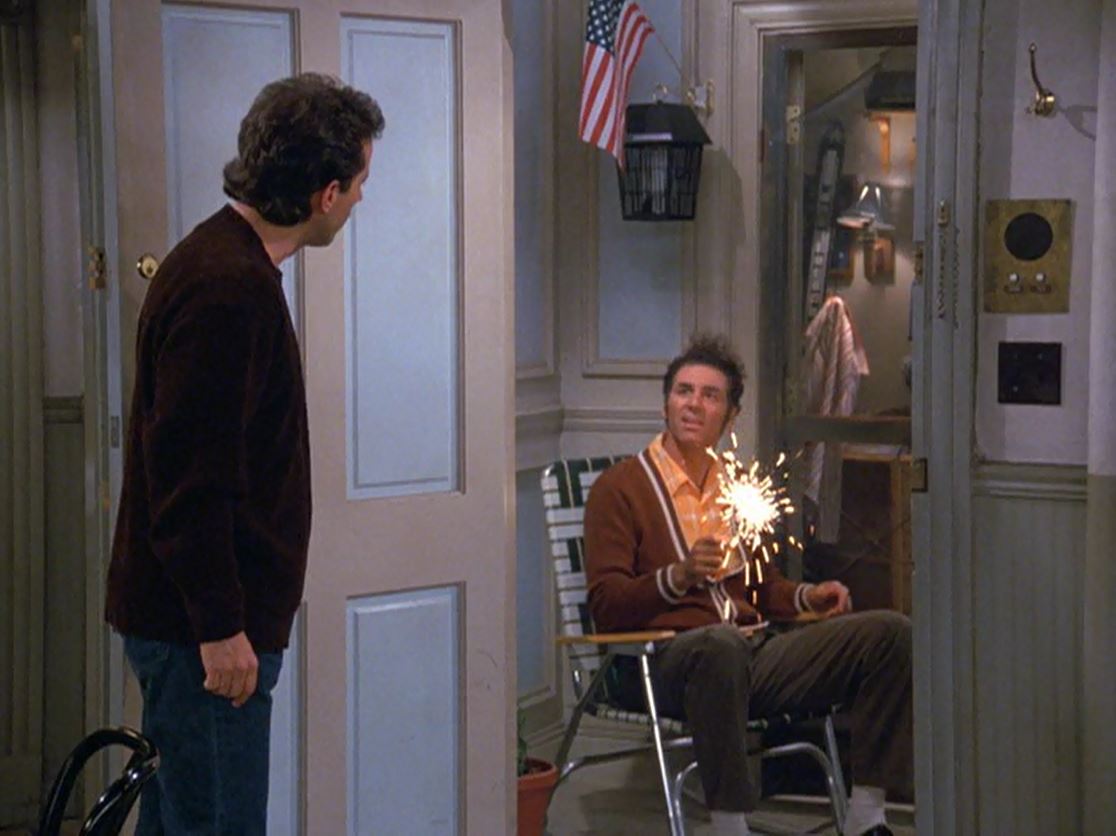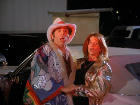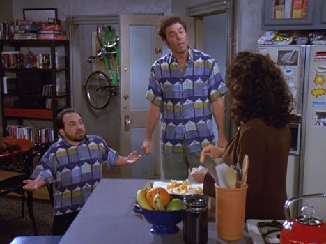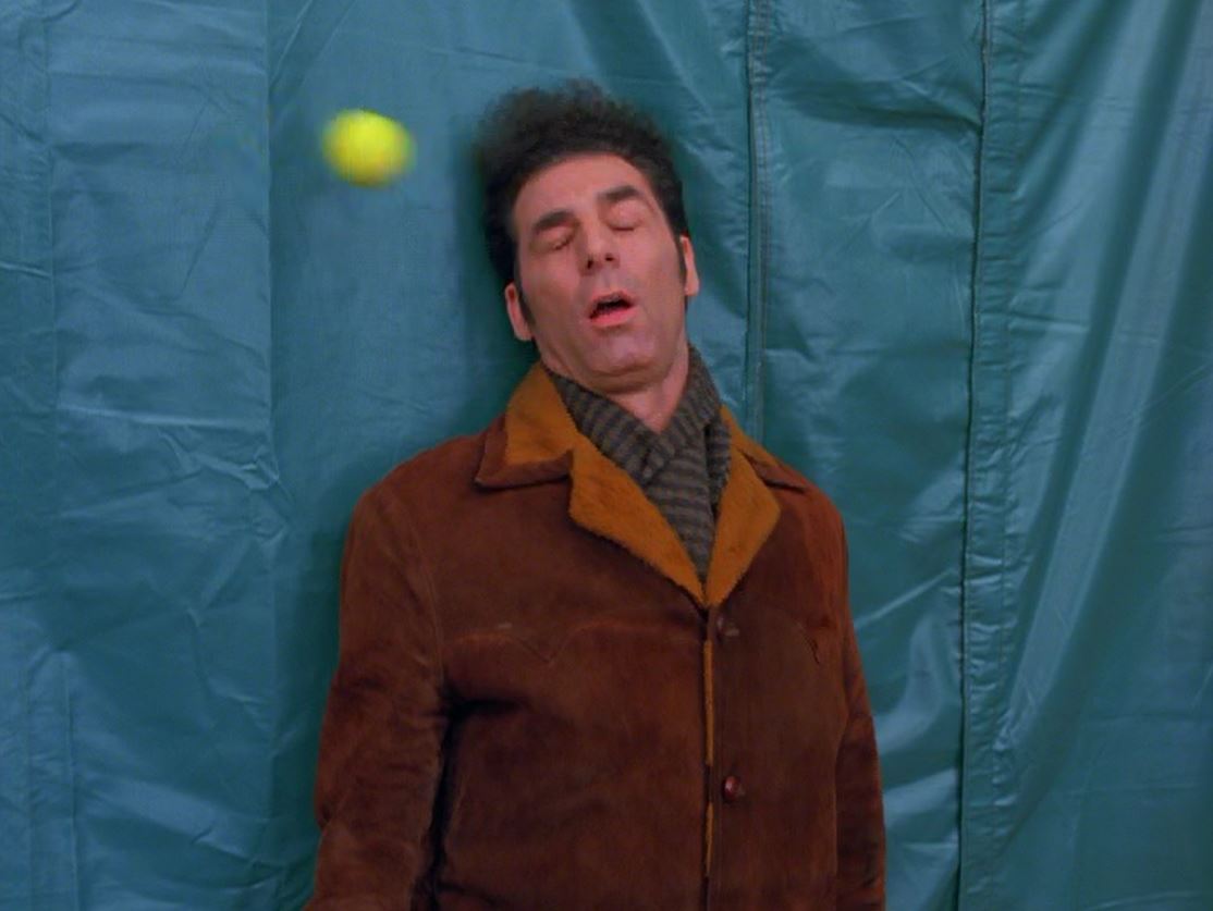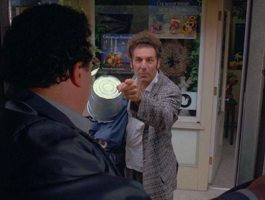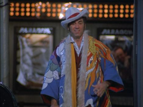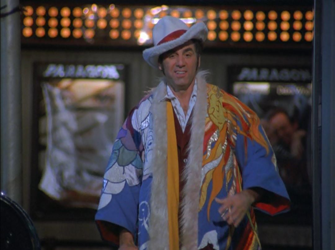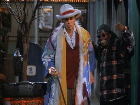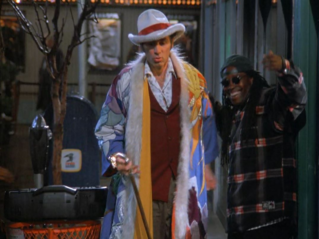 Kramer’s sequence toward the end of the episode is something I think about once a week. Wearing Joseph’s Technicolor Dreamcoat, a women’s hat, and the Peterman walking stick, Kramer strolls through the streets of New York City as a cartoon pimp from the 1970s. But the best part is the Lil Wayne-lookalike’s reaction as he sees the large, uncool man gallanting down the sidewalk. We are all that man.