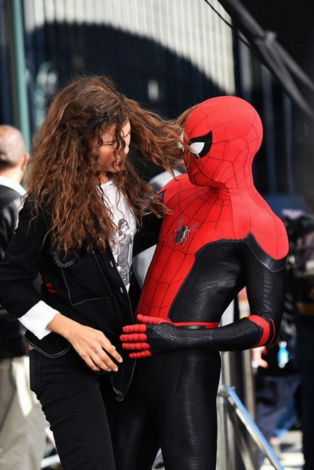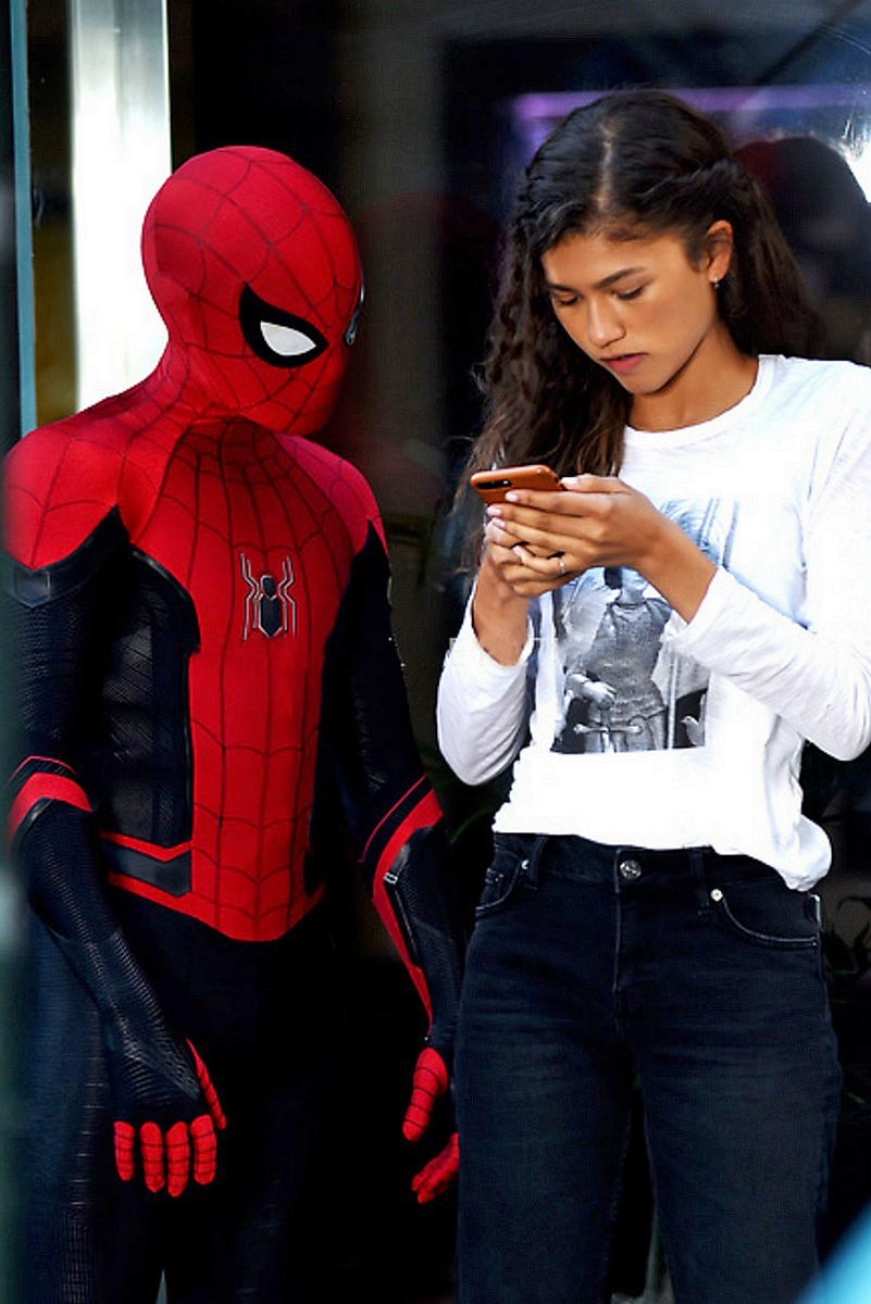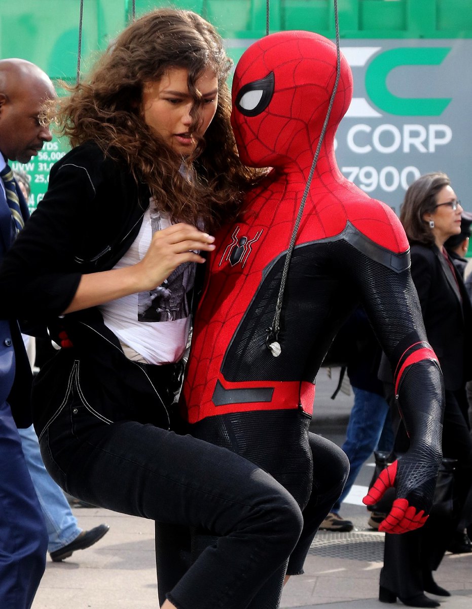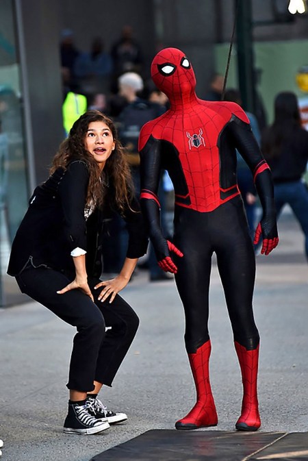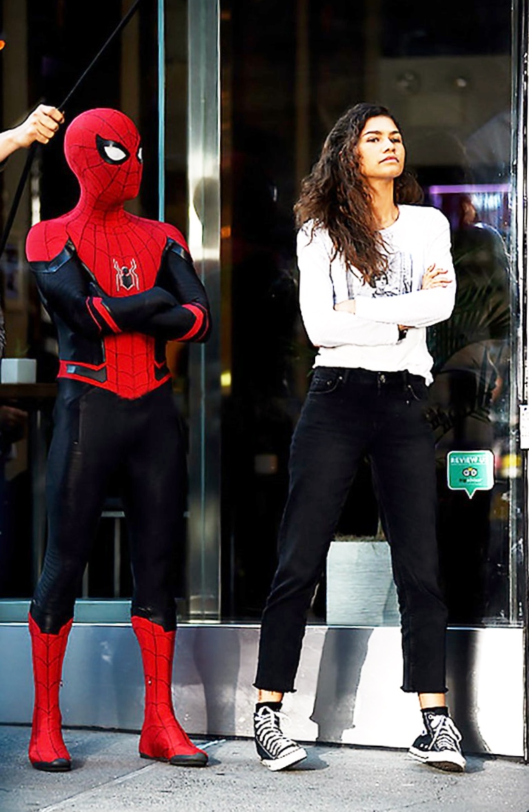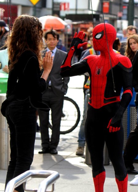 Tom Holland was spotted in full costume along with his co-star Zendaya on the set of Spider-Man: Far From Home in New York City on Friday.
