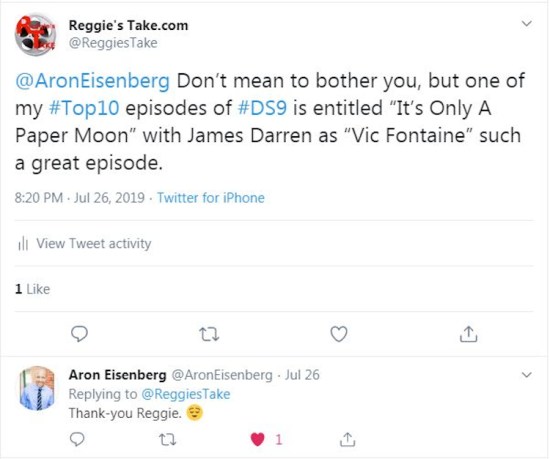 I just wanted to take a second and share something that in the grand scheme of life is really nothing, but near the end of July (2019) of this year I actually tweeted Aron Eisenberg about the DS9 episode “It’s Only A Paper Moon”. When I sent the tweet I didn’t expect any sort of reply. Mr. Eisenberg surprised me by replying and liking my tweet and for someone who’s nobody on Twitter; I found it a highlight that day.