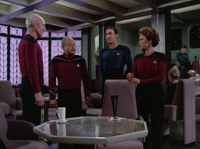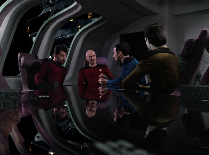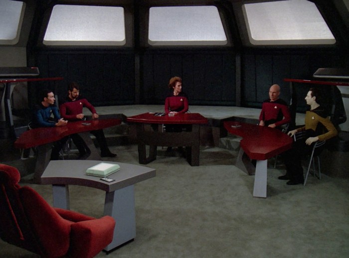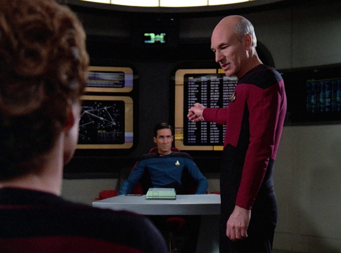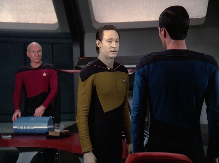 During a recess Picard talks with Guinan in Ten Forward who suggests that Maddox’s plan for reproducing thousands of androids like Data would be equivalent of slavery. Picard uses this and points out that Data meets two of the three criteria Maddox uses to define sentient life and asks the court what if Data meets the third, consciousness in the smallest degree. The court then rules that Data has the right to choose and formally refuses to undergo the procedure.
