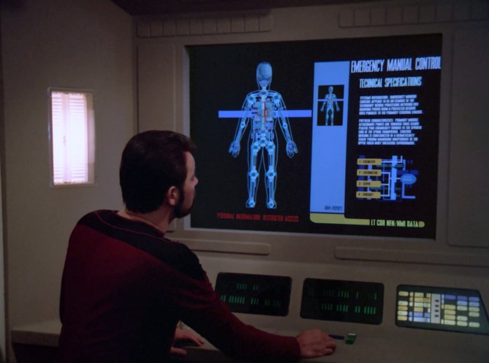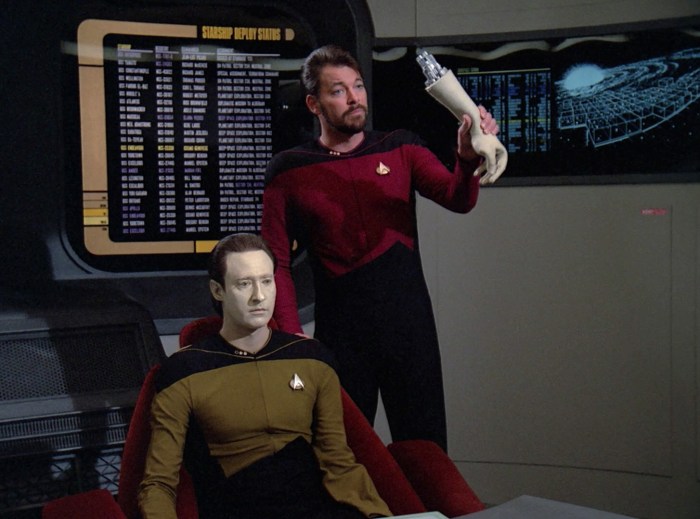 Captain Picard requests and is granted a formal hearing, but due to a shortage of legal staff on the Starbase it forces Riker the unenviable task of having to represent Maddox. Riker’s arguments portray Data as merely a machine constructed by man, and no more than the sum of his parts. In a striking final demonstration, Riker activates Data’s “off switch”, causing the android to shut down.
