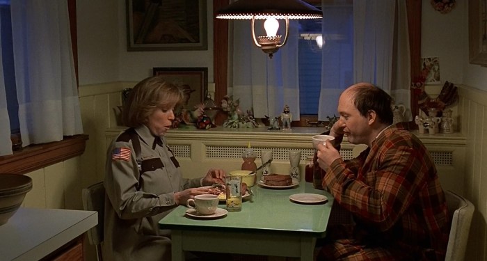 Brainerd police chief Marge Gunderson (Frances McDormand) discovers the dead trooper was ticketing a car with dealer plates and that two men driving a dealership vehicle checked into the nearby Blue Ox Motel with two call girls. After questioning the prostitutes, Marge visits the dealership, where Jerry insists no cars are missing.